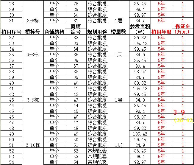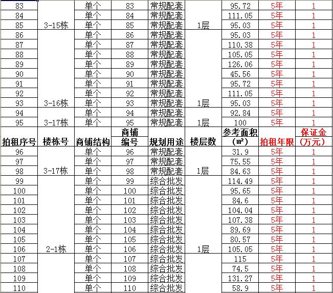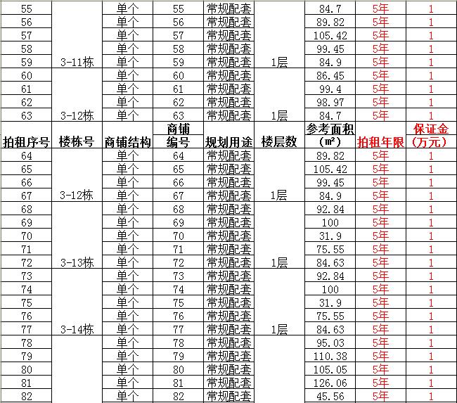 (一)拍租單個商鋪129間,使用期5年,每間商鋪預(yù)交競租保證金1萬元, 詳見商鋪簡介(欲競租多間商鋪,保證金類推);